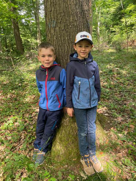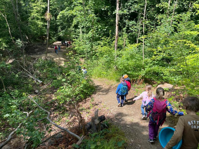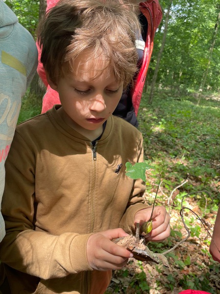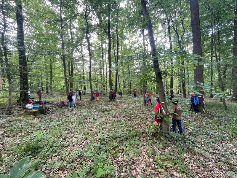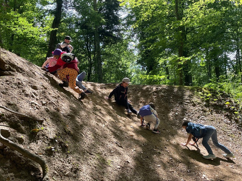 Unter wunderschönen Eichen begannen wir mit einer kurzen Begrüßungsrunde. Schnell äußerten die Kinder ihren Wunsch, unbedingt tief in den Wald zum „Bombenloch“ zu gehen – das eigentlich aus der Zeit des Eisenerzabbaus stammt. Dieser Wunsch konnte erfüllt werden, und schon bald liefen die Kinder voller Freude die kleinen Anhöhen hinauf, bevor sie mutig den steileren Hang am Bombenloch hinunterkletterten und rutschten.