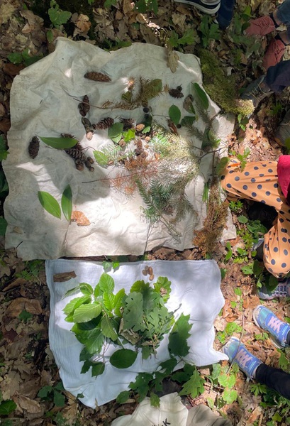 Unsere kleine Wanderung führte uns weiter in den Wald, bis wir eine wunderschöne Stelle erreichten, an der sowohl große, alte Bäume als auch kleine, junge Bäume zu sehen waren. Dort bildeten wir einen Kreis, und Marco breitete auf einem Tuch verschiedene Teile von Bäumen aus: Blätter, Zweige, Zapfen und Samen. Nun war es die Aufgabe der Kinder, diese Baumteile auch vor Ort im Wald zu finden. Voller Eifer machten sie sich auf die Suche – und schon bald fanden sie Buchen- und Eichenblätter, Tannenzweige, Fichten- und Douglasienzapfen, Eicheln und vieles mehr. Marco erklärte die Unterschiede zwischen Laub- und Nadelbäumen sowie zwischen Buchen- und Eichenblättern. Eine spannende Frage war: Wenn so viele kleine Tannen zu sehen waren, warum fand sich kein einziger Tannenzapfen? Die Antwort: Tannenzapfen zerfallen bereits am Baum, wenn ihre Samen reif sind – sie fallen also nicht wie Fichtenzapfen zu Boden und können deshalb nicht eingesammelt werden.