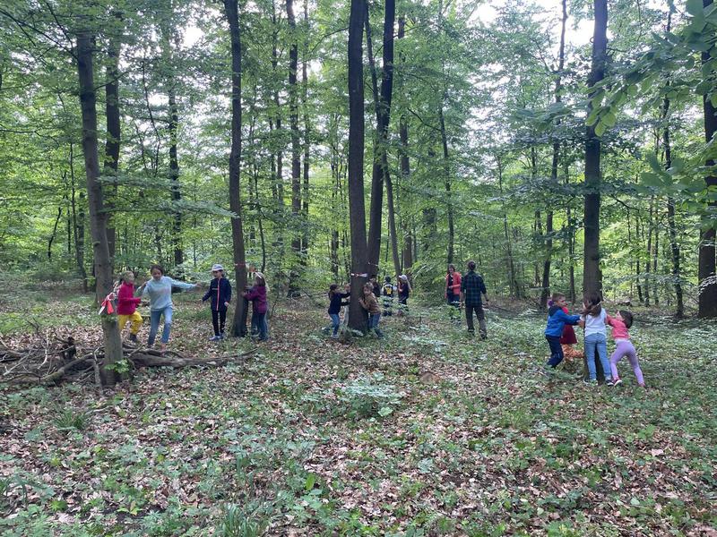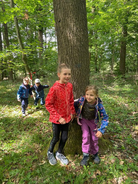 Nach all diesen Erkenntnissen war es Zeit für das Spiel „Bäumchen wechsel dich“. Immer zwei Kinder „besetzten“ einen Baum, indem sie ihn berührten. Ein Kinderpaar blieb zunächst ohne Baum und durfte mit dem Ruf „Bäumchen wechsel dich“ die anderen auffordern, schnell zu einem neuen Baum zu laufen, in der Zeit konnten sie versuchen einen der freiwerdenden Bäume zu besetzen. Das sorgte für viel Freude und Bewegung. Anschließend wurden die Kinder gefragt, welchen Baum sie gerade berührten. Wer die richtige Antwort wusste, durfte seinen Baum behalten, sonst wurde er an ein anderes Kinderpaar abgeben.