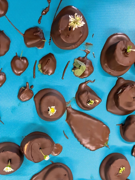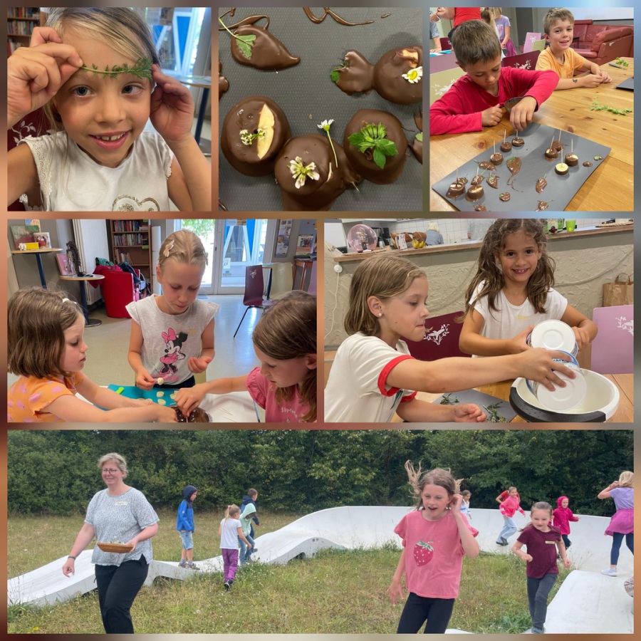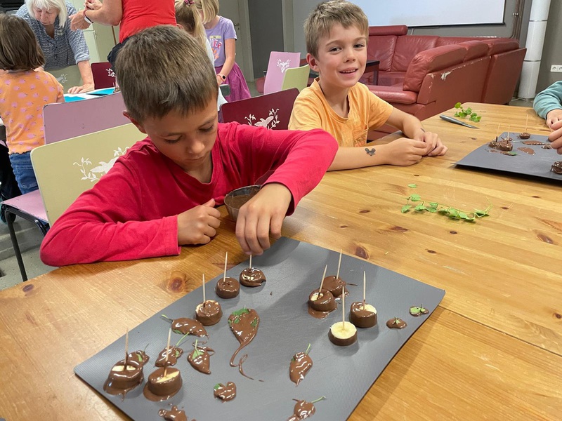 Zum Abschluss durften natürlich auch die selbstgemachten Pralinen aus Bananen und Schokoüberzug, die wir wunderschön mit Blüten verziert hatten, verkostet werden. Es war ein umtriebiger und interessanter kulinarischer Nachmittag und die Zeit verging wie im Flug. Schon standen die Eltern zum Abholen vor der Tür und durften auch noch ein wenig probieren.