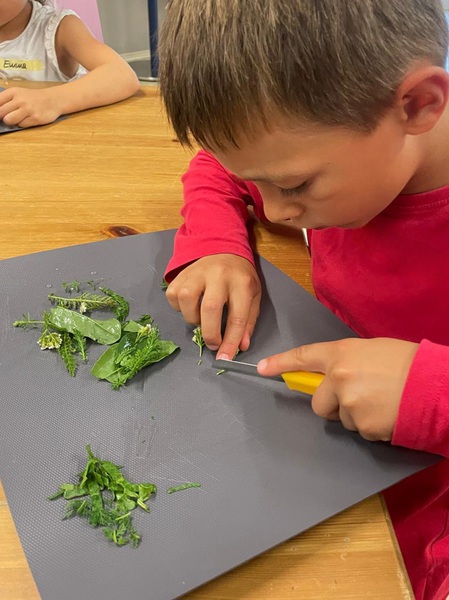 Bewaffnet mit diesem neuem Kräuterwissen ging es hinaus auf die Wiese. Dort sammelten wir diese Kräuter mit großer Begeisterung als Zutaten für einen würzigen Kräuterquark. Außerdem nutzen wir die Gelegenheit mal ausgiebig auf dem Pumptrack im Skaterpark zu toben. Nach dem Sammeln hieß es: die gewaschenen Kräuter klein schnippeln, da war Fingerfertigkeit gefragt, in den Quark einrühren und nach Belieben mit etwas Salz und Pfeffer würzen. Mit leckerem Baguette war das ein tolles Vesper, das uns wunderbar gemundet hat.