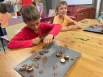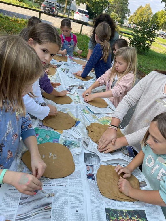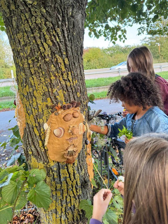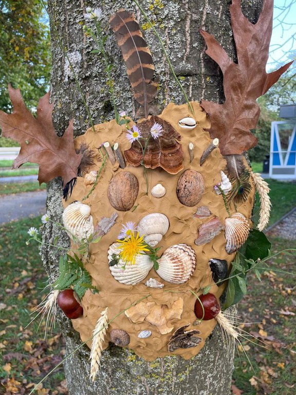 Jedes Kind erhielt einen großen Tonklumpen. Zunächst galt es, diesen flach zu klopfen und eine ovale Scheibe zu formen. Diese wurde an einen Baumstamm gedrückt. Hierbei musste ziemlich viel Kraft aufgewendet werden, was aber allen gut gelungen ist. Die Tonscheiben sollten nun zu Gesichtern gestaltet werden. Hierzu standen auf zwei großen Tischen zahlreiche Naturmaterialien bereit. Kastanien, Zapfen, Federn, Muscheln, Schneckenhäuser ebenso wie Äste, Weizenhalme, Baumpilze, kleine Steine und vieles mehr. Auf der Wiese wurden Löwenzahn und Spitzwegerich gepflückt. Aus all diesen Materialien wurden sehr kreative Gesichter gefertigt. Manche trugen Halsketten, andere hatten Sommersprossen oder Ohrringe. Beim anschließenden gemeinsamen Begutachten wurden die Gesichter ausgiebig bewundert und alle waren sich einig, dass bei einer Bewertung es nur 1. Preise gegeben hätte.