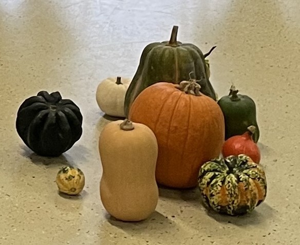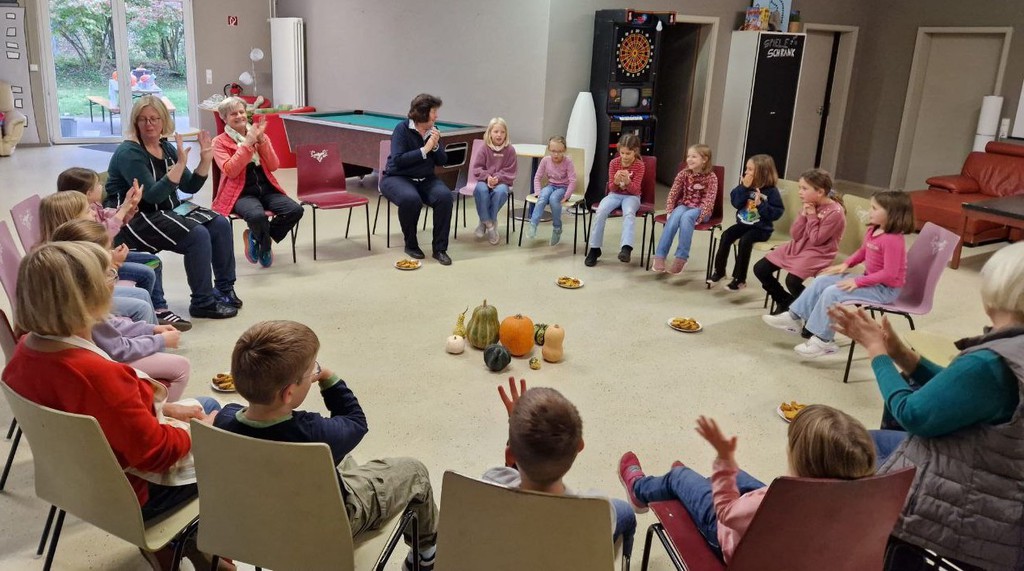 Angela und Christel trugen uns ein fröhliches Kürbisgedicht vor: ein Kürbis möchte nicht zu Suppe oder Gemüse verarbeitet werden und auch nicht im Schweinefuttertrog landen. Zu seiner großen Freude kommt ein Kind und schnitzt aus ihm ein Gesicht, und mit einem Licht im Bauch kann der Kürbis in dunkler Nacht leuchten – ein großes Glück für den Kürbis und die Menschen.