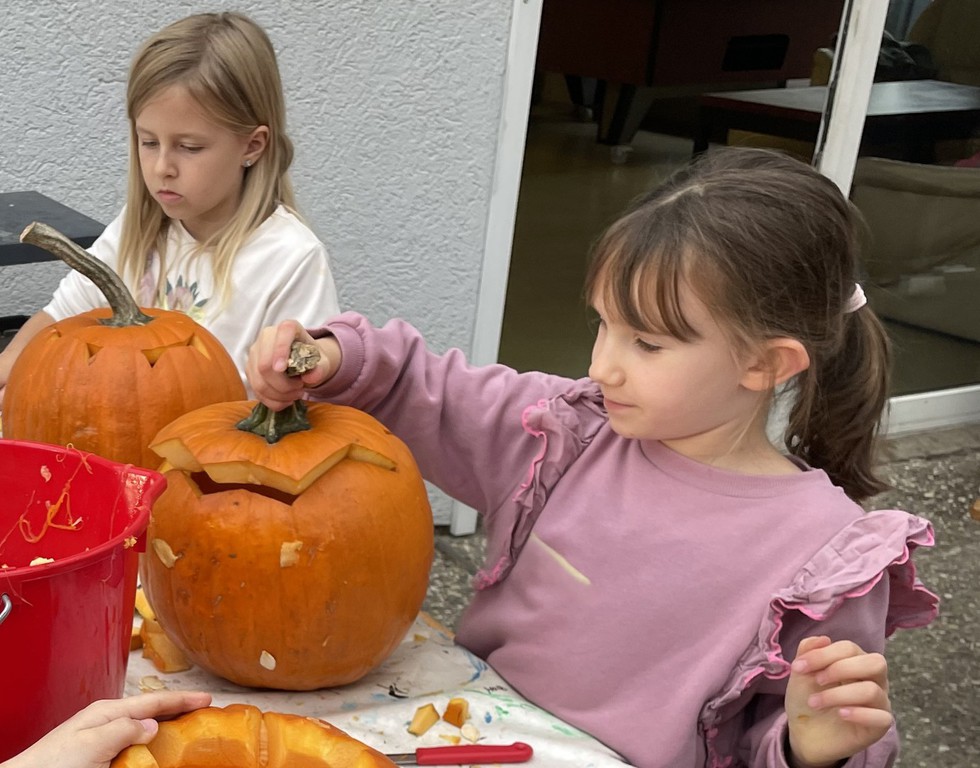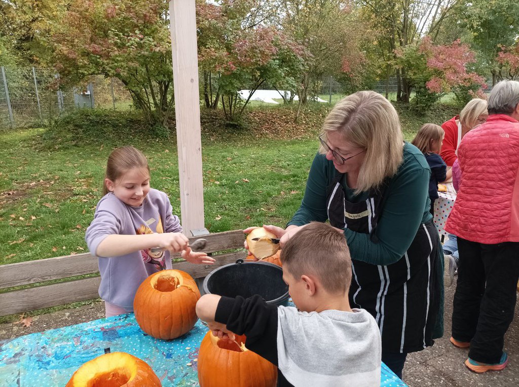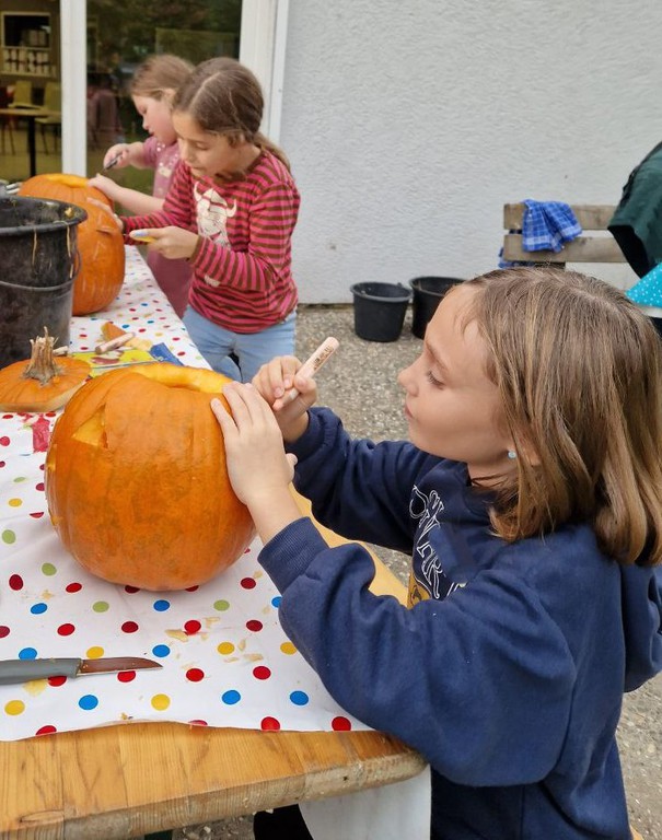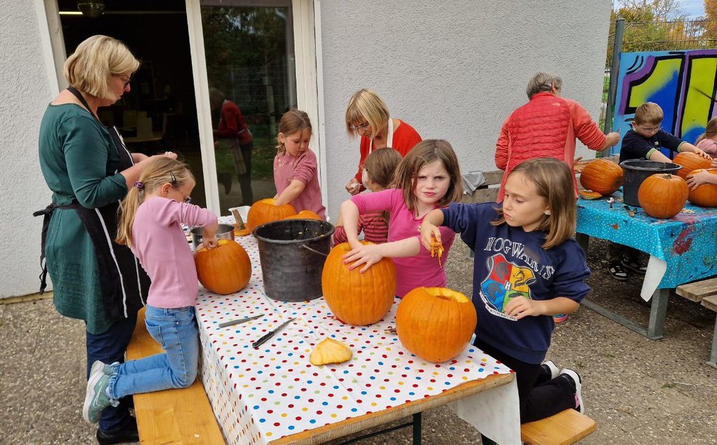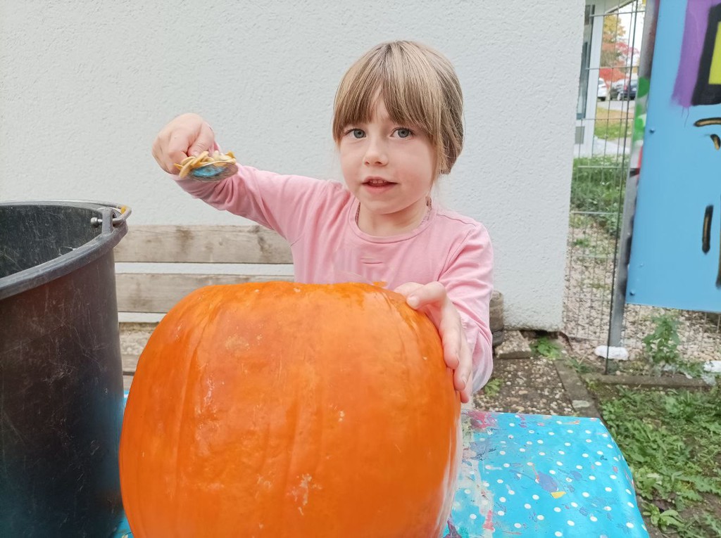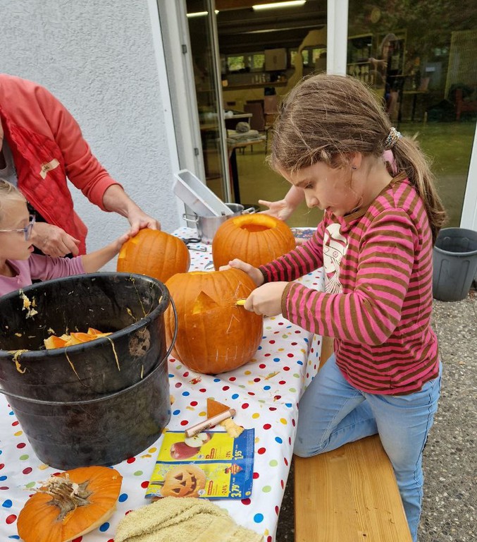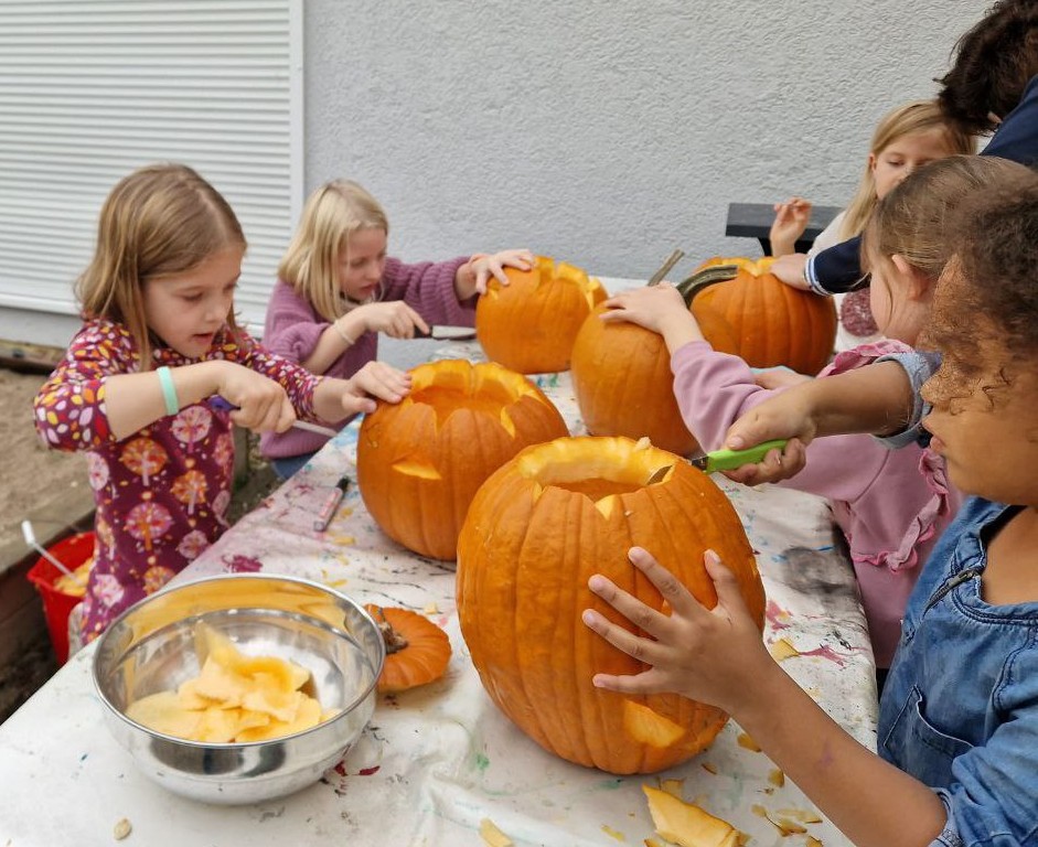 Zunächst wurde ein wenig darüber gesprochen, warum die Menschen ausgehöhlte Kürbisse als Laternen vor die Tür stellen und woher Halloween eigentlich kommt. Sogar ein Herbstlied wurde angestimmt! Dann ging es an die Arbeit: Mit scharfen Messern wurde zuerst der Deckel herausgeschnitten, dann mit großen Löffeln die Kerne und das lose Fruchtfleisch entfernt. „Mit der Hand geht es noch besser,“ und „Ist das schön glitschig!“ war zu hören. Große Mengen an „Kürbis-Innereien“ sammelten sich in Schüsseln und großen Eimern.
