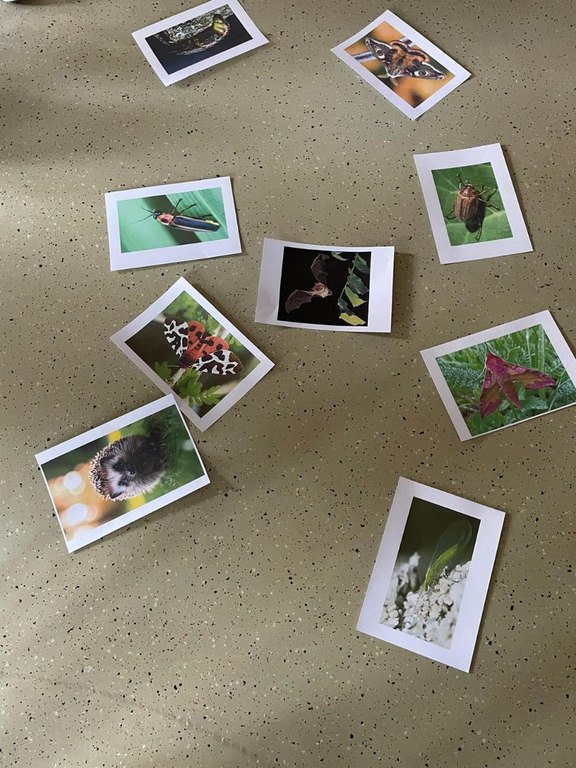 Wer flattert denn da? Auf die Frage, welche Tiere im Laternenlicht fliegen, kamen von den Kindern sehr viele Antworten: Nachtfalter, Fledermäuse, Motten, … Auf unseren Bildkarten