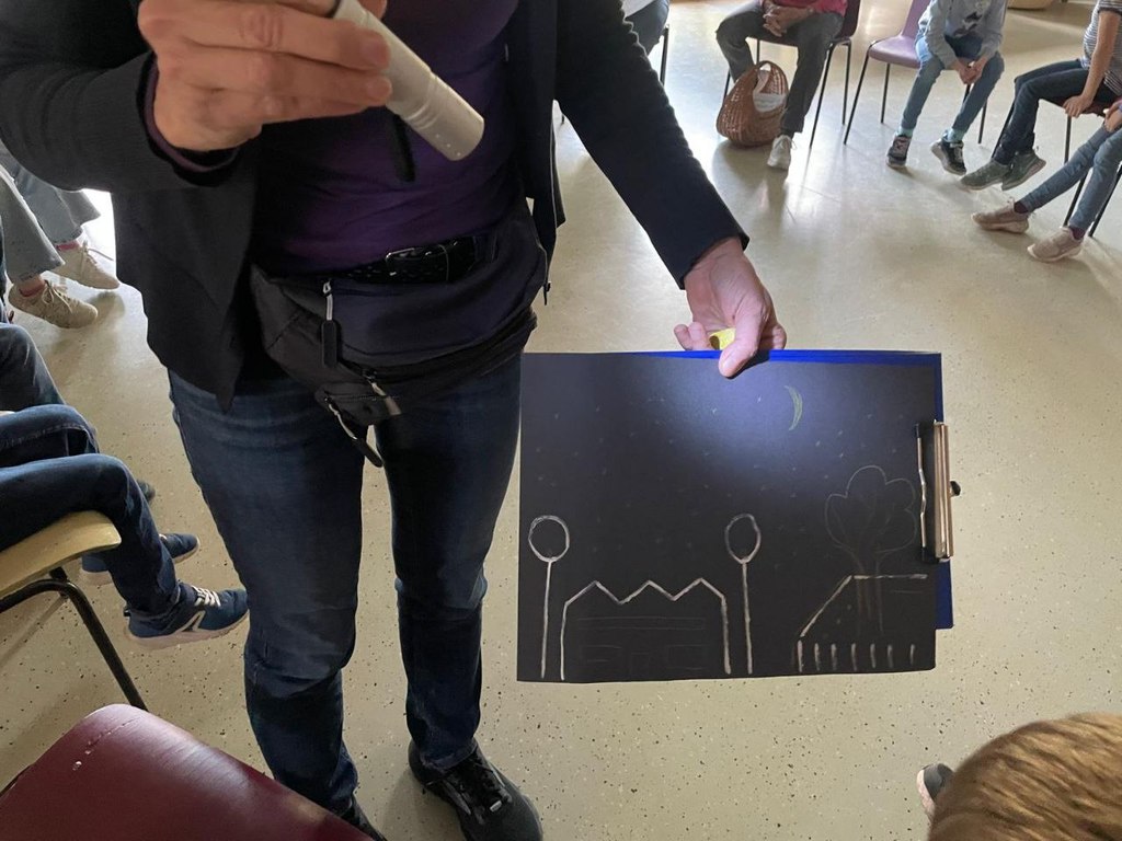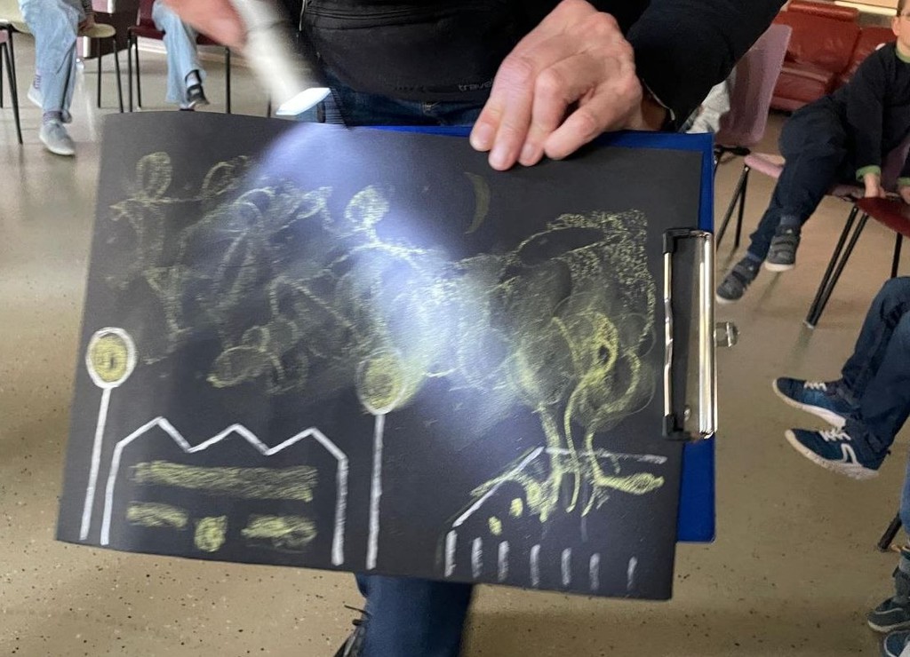 Aber was ist eigentlich „Lichtverschmutzung“? Das erklärte Rosemarie sehr anschaulich mit einer Kreidezeichnung: In einer Stadt gibt es Straßenlaternen, Gebäudebeleuchtung und