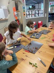 Nun ging es ans Basteln der Schneckenmobiles. Herbert hatte eine Vielzahl schöner Weinbergschneckenhäuser mitgebracht, dazu gesägte und durchbohrte Hölzer von der Feldulme, die man gut an ihrer gefurchten Rinde erkennen kann. Immer abwechselnd wurden die Schneckenhäuser und die Hölzchen auf Schnüre aufgefädelt und dann am längsten Holz befestigt. Es war gar nicht so einfach, die Schnüre in die Löcher zu bekommen, haltbare Knoten zu machen und das Ganze ins Gleichgewicht zu bringen. Aber am Ende konnte jedes Kind ein hübsches Mobile herzeigen. Zum Schluss gab es für jedes Kind noch ein „Schneckenüberraschungsei“ mit einem uralten Ammoniten-Fossil sowie ein Döschen mit einem zauberhaften Wasserschneckenhaus, das Millionen Jahre alt sind ist. Dieser abwechslungsreiche und spannende Nachmittag verging wie im Flug. Wir vom Team „Natur und Umwelt pur“ freuen uns schon sehr auf das nächste Treffen Ende Mai mit dem Waldmobil!