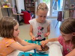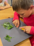 Sammeln und Salbe kochen: In Gruppen ging es nach draußen in den Hof des Familienzentrums und jede/r sammelte drei Spitzwegerichblätter, ein Storchschnabelblatt und drei Gänseblümchen-Blüten. An den vorbereiteten Arbeitsplätzen wartete für jede/n ein Babygläschen (der „Kochtopf“ für die Salbe) mit 3 Esslöffeln Olivenöl. Jetzt war konzentriertes Arbeiten gefragt: 25 Wachsplättchen abzählen, das „Grünzeug“ klein schneiden, alles ins Glas füllen und mit einem Weidenzweig umrühren. Nun 10 Minuten lang über einem Teelicht sanft köcheln lassen, bis alles Wachs geschmolzen ist. Anschließend wurde die Mischung durch ein Sieb in beschriftete Döschen gegossen und die Salben zum Festwerden in den Kühlschrank gestellt.